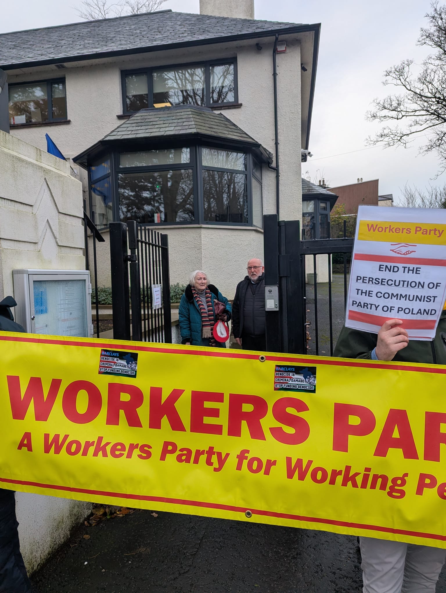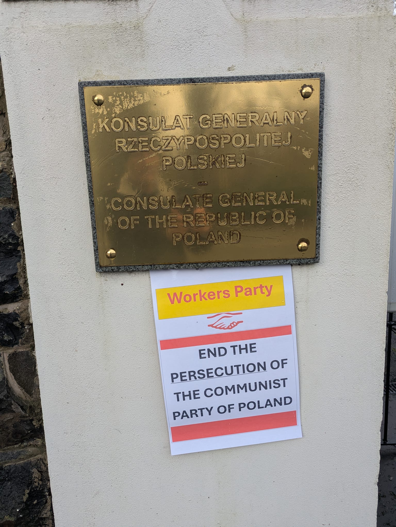 Today,1st December 2025, the Workers Party of Ireland, in conjunction with other member parties of the European Communist Action, held a Europe-wide mobilization with protests outside Polish embassies and consulates to oppose the Polish government’s anti-communist plans. The WP Ireland held a demonstration outside the Polish Consulate in Belfast and presented its criticisms and demands to the Consul.