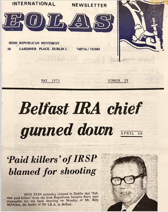 The actions of the ultra-leftists in 1975, which openly allied themselves with the reactionary sectarianism of the Provisionals, led inevitably to conflict. The murder of Sean Fox on 25th February was followed by a campaign of violence against members and supporters of the Republican Clubs. There was an attempt to murder Sean Garland in Dublin on 1st March. Paul Crawford (25) was shot dead on the Falls Road, Belfast, on 12 April 1975 and Liam McMillen was shot and killed on 28 April 1975.