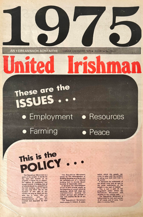 In January 1975, the United Irishman set out the policies for which we stood, stating that the Republican movement “stands for the men and women of no property. It fights for no religion, but against all exploitation and foreign control. It believes that all of Ireland should be controlled by the Irish working class. It rejects the idea that there can be real freedom in any part of our country as long as there are any who live in want, who are unemployed, who fear discrimination or who are crushed and degraded by their work.”